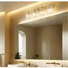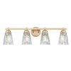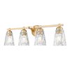 Textural influence creates overlapping diamond patterning on the clear glass shades of a 4-light vanity light you'll want to consider. A hint of glam sneaks in to add timeless sophistication to a light fixture with warm modern gold framing and subtle detail. Master and guest bath spaces welcome this wide fixture featuring dimming functions that allow customized lighting levels.