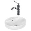 It features a round shape. This vessel set is designed to be installed as an above-counter vessel set. It is constructed with ceramic and it comes with an enamel glaze finish in white colour. It is designed for a 1 hole faucet.