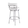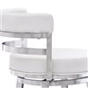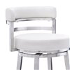 The Armen Living Madrid armless bar stool features a unique aesthetic that is certain to work well in any modern household. The Madrid durable brushed stainless steel frame is accompanied beautifully by its white faux leather seat and back. The upholstered low back is rounded, providing the user with exceptional support while the 360° swivel seat allows for enhanced mobility. Madrid contemporary straight leg design endows the bar stool with a chic quality that is further accented by the inclusion of a round footrest. The Madrid legs are tipped with floor protectors, assuring that the bar stool will not slip on or scratch hardwood or tile floors. The beautiful Madrid is available in 26 inches counter height.