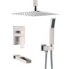 - Features a 10-in stainless steel rain shower head and a handheld shower