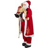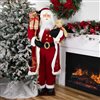 Celebrate the season with this cheerful Santa Claus figure. Wearing his classic red and white suit with faux fur trim, black boots and belt, Santa holds a festive teddy bear and carries a gift-filled bag over his shoulder. Mounted on a wooden base, this 60-in tall display figure is perfect for indoor holiday décor. Not intended as a toy.