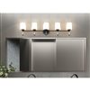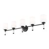 Against pale tile or painted cabinets, the deep finish of this matte black 5-light vanity light traces a strong horizontal line that gives the room a bit of gallery drama. Five opal glass shades seem to float on clear stems, so the piece still feels light in spirit even as it supplies generous illumination for shared sinks and family routines. In a modern farmhouse, loft, or streamlined renovation, it bridges rustic textures and contemporary details, ensuring the whole space feels deliberate and stylish.