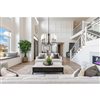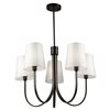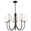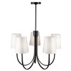 From the S&C design firm, with strict direction from Steven Sabados, the Rhythm collection chandelier features a traditional type frame with flat tubular arms. The frame is finished in matte black and complimented with linen hardback white shades.