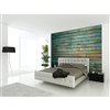 A bold teal wood wall mural. This design has a distressed look with thick planks. Measures 9-ft 10-in x 7-ft 10 in when assembled.