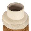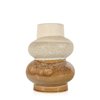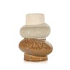 This table top ceramic vase showcases a distinctive and artistic design, available in two sizes. It features a multi-tiered structure with each section having its own unique texture and colour. The top section is a creamy beige with a smooth finish, providing a soft and elegant look. The middle section has a speckled grey texture, adding a tactile and visual contrast. The lower sections display a rich glossy brown hue, giving the vase an earthy and organic feel. This combination of shapes, colours, and textures makes the vase a versatile and eye-catching piece for various interior styles.