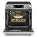 Enjoy optimal cooking performance using this 30-inch Café convection range built-in. Made of glass-ceramic, the cooktop's surface is smooth and easy to clean. It features five elements with one 3600 W power broil element, which provides high heat and accommodates different sizes of cookware. You can control the oven's functions using voice-activated commands from a smartphone. This Café electric range slide-in oven sits evenly with the kitchen's countertop for a sleek, modern look. The oven uses a convection system that distributes heat evenly to ensure meals bake and roast uniformly. A built-in temperature sensor tells when your meat is well-cooked. This slide-in single oven has a warming drawer, which keeps dishes warm without overcooking. The 5.7 cu. ft. self-cleaning oven burns off grease and food residue for easy cleaning. This range measures 29.87 in W x 37.4 in H x 29.53 in D, and it has a 1-year warranty on parts and labour.