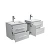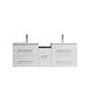 This modern double wall mounted bathroom vanity features an elegant white finish. It's simple, minimalist look is sure to modernize and liven up any bathroom design whether dark, light or in between. This vanity contrasts beautifully with any ceramic tiling style.
