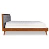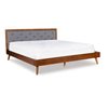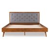 This wood and upholstered queen size bed in mid-century modern design will elevate the master bedroom in style and elegance. A walnut finished wood frame is accented by a button tufted headboard upholstered in a complimentary medium gray fabric. Includes the headboard, footboard, side rails and slats. Perfect for either memory foam or spring mattress.