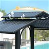 Enjoy outdoor living in style with this elegant and durable gazebo. Instantly create an outdoor gathering spot for family and friends away from the glaring sun and pesky insects. Crafted from rust-resistant aluminum alloy with a sleek black powder-coated finish, it offers long-lasting protection and stability. The 2-tier steel roof provides excellent ventilation while blocking UV rays, rain, and heat. This gazebo is the perfect addition to any backyard or patio.
