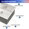 Rainlex Undermount Single Bowl Stainless Steel Kitchen Sink with dent-resistant T304 stainless steel for superior strength and durability. Surfaces are rust and stain-resistant, easy to clean, and long-lasting. With the undermount design, this sink installs seamlessly for a clean look with no exposed mounting deck, allowing you to wipe water and crumbs into the sink. The deep single bowl design fits large items while helping to contain mess and splatter.