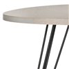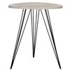 Contrasting colors and textures pack a punch in the chic and contemporary Wolcott side table. A round grey wood-grained MDF top and triad of black iron hairpin legs make an open, airy statement in beside a living room sofa or bedroom armchair.