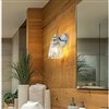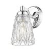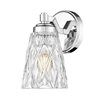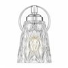 Perfect for a master or guest bath space, this 1-light wall sconce reflects glam design and materials as it offers accent lighting with dimming options. Textural diamond patterning on clear glass creates a conical shade, with a brilliant chrome finish metal frame delivers intriguing detail. This fixture will add a luxe look to any space.