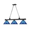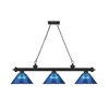 - With a dramatic, matte black finish frame and three dark blue acrylic shades, this traditional metal billiard light adds a colourful, modern edge to classic interior décor