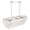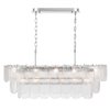 The linear island type chandelier from the Bianca collection exudes elegance with its cascading clear Piastra glass panels that shimmer like delicate ice sculptures. These textured glass elements are gracefully suspended from a polished nickel frame, radiating a sense of refined artistry and grace. It makes a perfect addition to any dining room with rectangular table or in a kitchen over an island counter.