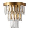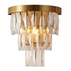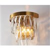 This exquisit wall sconce is in a gold finish. The frame is made out of metal, and it comes with clear hanging crystals. The wall sconce can be used in modern vanities, hallways, and more