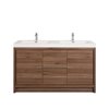Discover the timeless beauty and smart design of the Ember Collection where warmth meets modern functionality. This 48-in double freestanding vanity features a warm natural walnut finish that adds a welcoming touch to any space. The design includes a moisture-resistant PBC frame for lasting durability and a white high-gloss polymarble countertop with a sleek rectangular sink, offering both elegance and practicality. With three deep drawers and two fixed shelves tucked behind soft-close doors, there's plenty of room to organize your essentials. Chrome-plated aluminum handles add a contemporary edge, making this vanity a perfect balance of form and function for any modern home.