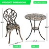 Enjoy your morning coffee out on the patio with the lighthearted charm of this delightful 3-piece bistro set. Constructed out of cast aluminum with a durable powder-coated bronze finish. Featuring two chairs and a small round bistro table with an umbrella hole, this intricate floral detailing is sure to exude graceful styling to your outdoor decor. With its small footprint, this compact set is the perfect addition for any patio, balcony, or small porch.