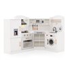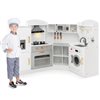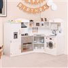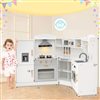 This kitchen playset features a toy ice maker. The rotatable faucet can be turned on/off with a switch. Accessories include cookware, a chef's hat and apron, cup, ice cube tray, pot and pand, plates, spoon, spatula, knife and cruets. A top shelf, hanging hooks, towel rack and 4 open compartments are provided to store all accessories, helping children to develop organizational skills. The clever corner design uses less space, making this playset an ideal addition to families.