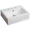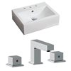 It features a rectangle shape. This vessel set is designed to be installed as a wall mount vessel set. It is constructed with ceramic and it comes with an enamel glaze finish in white colour. It is designed for a 3h8-in. faucet.