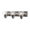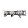Bring a beautiful new look to your bathroom or vanity area with this charming vanity sconce from the Birmingham collection. A wide, rectangular, black chrome finish back plate supports three simple, graceful arms that hold three hand-blown clear glass shades. The clean lines of this updated classic will make this piece an appealing part of your home.