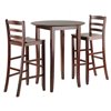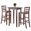The set comes with round high table perfect addition to your kitchen or game room. Matching ladder back stool is 29-in seat height. Constructed from solid wood and finish in antique walnut. Ready to assemble.