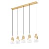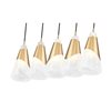 Embrace elegant sophistication with a modern five-light linear chandelier designed to impress. It features a modern gold finish over an elongate canopy and curvy metal shroud that decorative each shade. Icy artisan glass with a chic swirl pattern is an intriguing finishing touch, lending icy cool ambiance over a kitchen island or dining table.