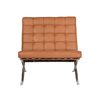 Tufted stylish lounge chair with leather upholstery and stainless-steel legs with a polished finish.