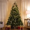 Offering a full shape with layered branches to hold all your decorations, the Real Touch Cumberland Pine fills your tall order for a 9-foot Christmas tree with charm and sophistication.This Real Touch artificial Christmas tree is pre-lit with 900 warm white LED lights and features concave wide-angle bulbs. It has 7678 branch tips and a 65-in green lead cord. The full-profile tree includes hinged branch construction and is UL certified for indoor use only. If one bulb burns out, the rest stay lit. The tree comes in 4 pieces for easy assembly, including a free black metal tree stand, replacement bulbs, and spare fuses. Input is 120 volts 60 hertz .50 amps; output is 30v/.40a. Dimensions are 9-ft high with a 63-in base diameter. The stand measures 7.5-in high by 24-in wide. Materials include PE, PVC, metal, plastic bulbs, and wire.