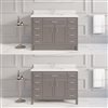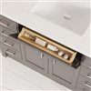 Upgrade your bathroom with a blend of modern design, smart storage, and durable craftsmanship. This premium freestanding vanity features a solid hardwood frame, an engineered stone countertop, and a sleek rectangular undermount ceramic sink for a timeless yet contemporary look. Soft-closing drawers and a patent-pending stealth organizer provide smooth functionality and organized storage. The 0.75-inch white engineered stone countertop with elegant grey veining is paired with a 4-inch backsplash to protect walls while adding a refined finish. Designed for easy installation, it includes contractor-friendly plumbing access, adjustable shelving, and customizable faucet configuration. Built with durable materials and premium zinc alloy hardware, it offers reliable performance and ample storage, backed by a 2-year limited warranty. Perfect for spa, master or guest bathroom upgrades. Note: Faucet, mirror, and pop-up drain not included.