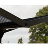 - The aluminum frame is made of strong, rust-resistant, coated metal and includes integrated rain gutters to redirect rainwater