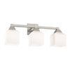 This bathroom vanity light is sure to provide reliable illumination without sacrificing style. It features three satin opal white glass shades with an open bottom, exposing the bulbs inside. A brushed nickel finish covers the backplate and accents the light.