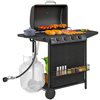 - This large gas BBQ grill includes a side table for prep, a storage shelf, a side hook for the tank, and a spice rack, making it a practical centerpiece for your garden