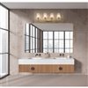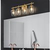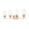 A timeless marriage of glass and metal fits the mood in elegant settings with a 4-light vanity light that illuminates master or guest bath spaces. Burnished brass finish steel construction is sophisticated and stylish, welcoming a row of four delicate clear glass goblet shades. Light dims with a built in dimming feature creating customized levels of illumination for day-and-night functions.