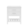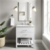 Transform your bathroom with this exquisite 30-inch vanity, a perfect blend of elegance and functionality. Crafted with a pristine white finish, this vanity exudes a timeless charm that will elevate the aesthetic of any bathroom. It includes two sets of hardware, brushed nickel and matte black, so you can customize your theme. The stunning white engineered stone top features delicate light grey veining, adding a touch of sophistication. Equipped with a rectangular white vitreous china under mount sink, a convenient tilt-out drawer, and a full-extension drawer on soft-close glides, this vanity offers ample storage space for all your bathroom essentials. The spacious open bottom shelf provides additional storage to keep your bathroom organized and clutter-free. It arrives fully assembled and pre-drilled for an 8-inch widespread faucet for hassle-free installation (faucet not included). Experience luxury and functionality with this elegant centrepiece for your bathroom oasis.
