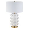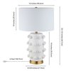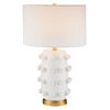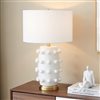 The bold silhouette of this table lamp is sure to become a focal point in your living room, bedroom, or workspace. The gently curved lines of the matte ceramic body are punctuated with spherical orbs, creating a textured, sculptural look. The fixture is finished off with a simple drum shade and classic brass base. Create a striking style moment in any room!