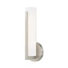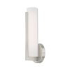 State of the art LED components deliver superior quality of light for the bathroom area while the sleek design and brushed nickel finish add sophistication with a modern look. The satin white cylindrical acrylic diffuses the light to provide a soft glow.