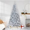 Create cherished holiday memories with this enchanting centrepiece. This stunning silver-tone tree brings elegance and sparkle to your celebrations. Its shimmering tinsel branches exude sophistication ready to be adorned with your personal touch. Unlit for your convenience customize with your favourite lights ornaments and garlands for a personalized festive display. Complete with a sturdy metal stand this tree ensures stability and style throughout the season. This 9 ft unlit medium profile artificial Christmas trees features 1960 tapered tips, each 2-in wide, with hinged branch construction. Designed for indoor use only, it offers easy 5-piece assembly including a FREE solid white metal tree stand. Dimensions: 9 ft high, 12-in from the floor to the first branch, 53-in base diameter. Stand measures 7.5-in high by 26-in wide. Made of PVC and metal.