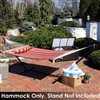 Bring comfort and style to any yard, patio, deck, front porch, campsite, or any other outdoor space with this quilted hammock! The hammock includes a detachable pillow (that attaches with buttons) for a comfortable position when napping or relaxing after a long day. Simply hang the hammock between trees, posts, or on a 12 to 15-ft hammock stand (stand not included). This 2-person hammock is made from a durable polyester material that is dye-treated to make it UV resistant, ensuring outdoor relaxation for years.