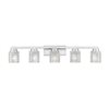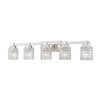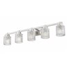 Texture and artistry team up to produce tasteful glam in a 5-light vanity fixture perfect for larger master and guest bath settings. You'll love the subtle yet sophisticated detailing on its brushed nickel finish steel framing, with textural clear glass shades showing off precision diamond patterning. This dimmable light fixture blends aesthetics with function to suit the needs of custom living areas.