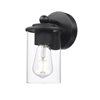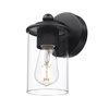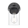 Brighten your vanity with the impeccable illumination and modern style of a contemporary one-light wall sconce. A cylinder of clear glass provides direct illumination, perfect for tasks and ambiance, while an eye-catching matte black finish frame adds decorative detail and depth in a modern bathroom or living area.