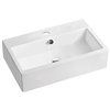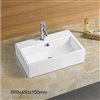 It features a rectangle shape. This vessel is designed to be installed as a above counter vessel. It is constructed with ceramic. This vessel comes with a white enamel glaze finish. This product is designed for a 1-hole faucet.