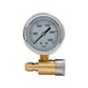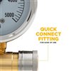 BE Power Equipment pressure gauge for pressure washers. The gauge is mounted to a quick-connect fitting that can be easily connected to any pressure washer with matching 3/8-inch fittings. Normally mounted directly to the pump, and then the high-pressure hose connects into the gauge. Glycerine filled gauges are more reliable and durable than dry gauges. The 2.5-inch face is easy to read and measures up to 5000 PSI.