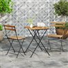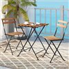 Enhance your living space with this elegantly crafted 3-piece patio bistro set, featuring a sleek design that balances functionality and style. Constructed from premium acacia wood, the tabletop, seat and back of this furniture set withstand long-time use and showcase much elegance. The whole table and chair set is supported by solid metal frames with anti-slip foot pads for added stability, while fixing screw of support rods ensures reinforced strength. The quick-folding chairs offer practicality and ease, allowing for simple storage and transport. Whether positioned indoors or outdoors, this patio set fits seamlessly into any setting from garden to dining room.
