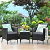 This 3-piece rattan furniture set includes 2 rattan chair and a coffee table. The rattan chair comes with comfortable cushions that add elegance and practicality. The chairs feature ergonomic armrests, and the cradle-shape seat provides a relaxing zone. It is made of a premium all-weather wicker with exquisite weaving technique.