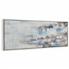 Get lost in this hand painted abstract featuring calming blue and grey hues that are subtlety accented using gold leaf. Framed with a silver floater frame, this artwork is the perfect size for over your bed or sofa. 25" x 2" x 72"