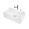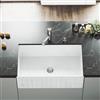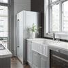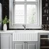 This farmhouse kitchen sink by VIGO® features a non-porous solid construction that resists fire and chemicals. The option to install with either the distinctive slotted or flat apron front on display gives this kitchen sink a custom touch. Includes kitchen faucet with pull-down, dual-action spray head and 360° swivel and solid brass construction, making it not only functional but durable over time. This set comes complete with strainer and soap dispenser. Limited lifetime warranty.
