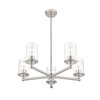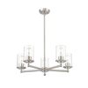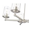 Complete a timeless kitchen or living area with the understated flair of a modern five-light chandelier from the impeccable Thayer collection. Clean lines and gentle curves highlight its silhouette, with cylinders of smooth, clear glass surrounding each light and offering a light, airy ambiance over a breakfast nook or entryway. A classic brushed nickel finish adds the perfect touch of sleek sophistication.