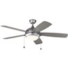 The Discus indoor/outdoor 52-in ceiling fan in painted brushed steel features a 3-speed motor with a 12-degree blade pitch. The Discus ceiling fan is the wet-rated outdoor version of the best-selling Discus ceiling fan. This 52-in, 5-blade fan features an integrated 20 W LED light with 800 lumens output, pull-chain operation with 3 speeds and manual reverse. The Discuss outdoor is wet-rated and an excellent choice for outdoor spaces.