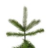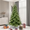 This realistic tree comes unlit, is made with a beautiful blend of 1402 PE and PVC tips on metal hinged branches, a metal tree stand is included.