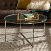 Style meets practical with this mid century modern inspired round coffee table with a crisscross designed base. The x-base is made of metal, painted in gold for a splash of elegance. It is sure to please on its own, or when styled with our matching side table, while complementing any living room aesthetic. Tie the whole room together even more, by decorating the round table top with a tray to place books, a clock, or artistic pieces on.